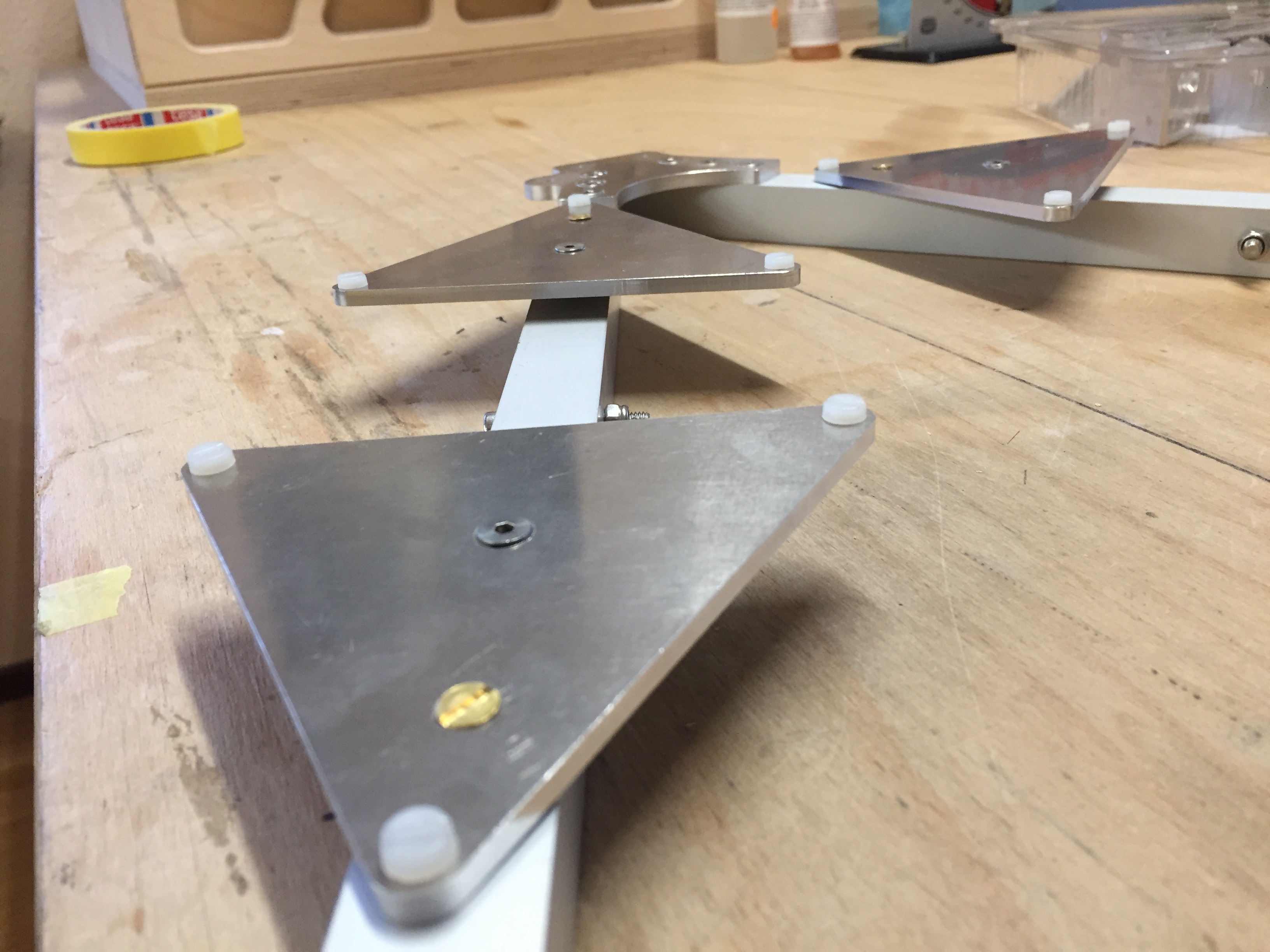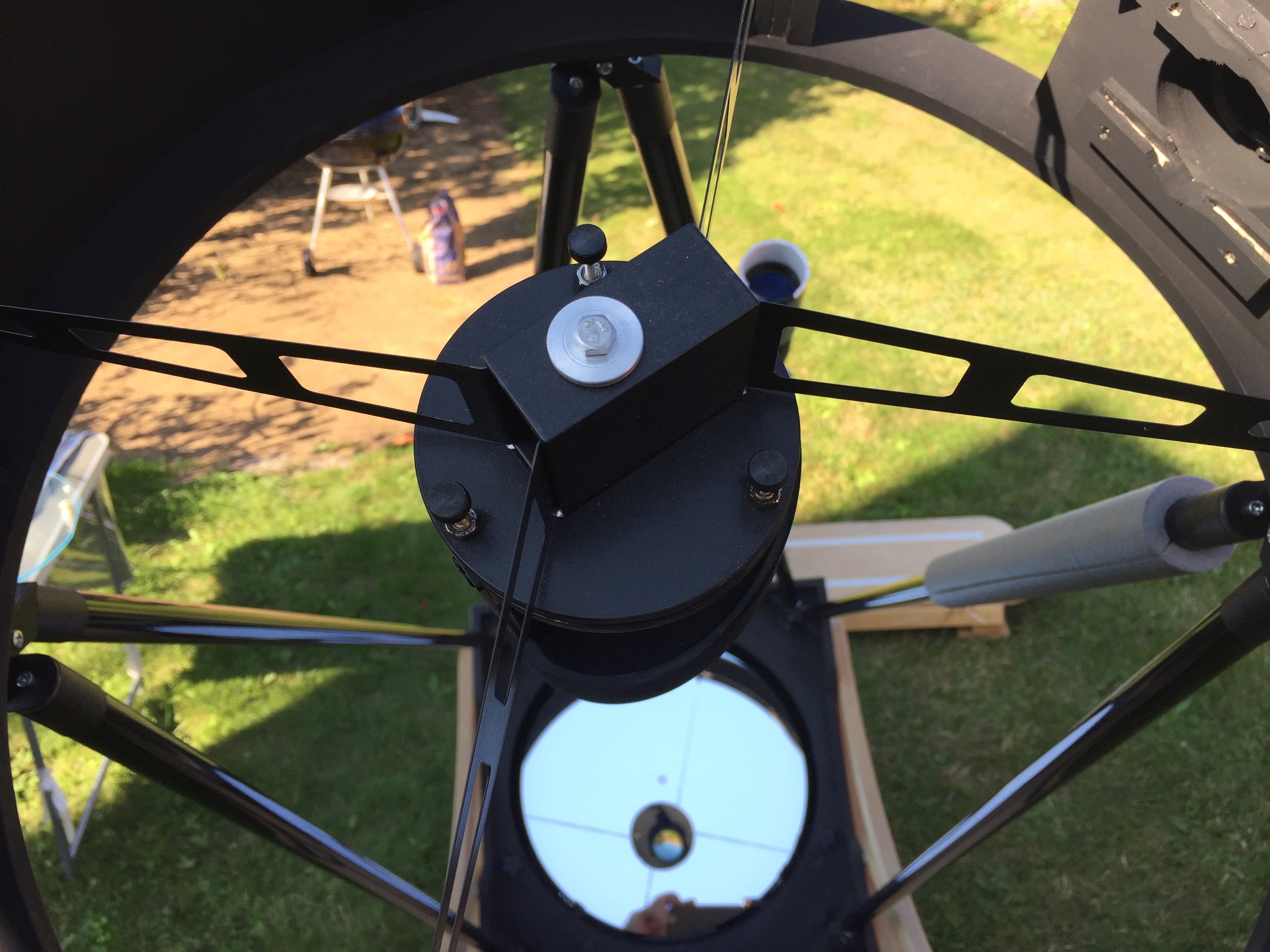 Die Fangspiegelspinne ist exzentrisch ausgeführt, dass bietet maximale Steifigkeit bei minimalen Zugkräften. Die Fangspiegelhalterung kann sich des Weiteren nicht um ihre Längsachse verwinden. Die Spinnenbeine sind als flaches Dreieck ausgeführt, auch hier kann sich nichts bewegen. Die Halterung selber besteht aus dem Halter selber, der mit drei Schrauben gegen eine Aluplatte justierbar gekippt werden kann. Die gesamte Halterung ist bereits mit dem notwendigen Offset für f/4.1 ausgelegt. Daher ist die Bohrung nicht mittig, sondern leicht versetzt.